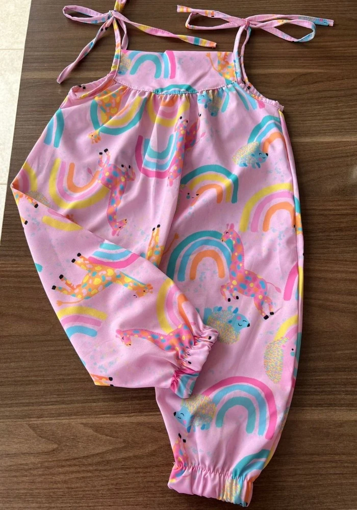 Mais cor e fofura para os dias da sua pequena! Esse macacão super delicado é feito com tecido leve e confortável, com estampa divertida de girafinhas coloridas e arco-íris em fundo rosa. As alças com amarração nos ombros permitem ajuste perfeito, enquanto o elástico nas pernas garante liberdade de movimento e muito charme!